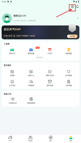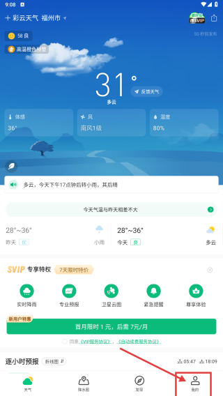 1、打開彩云天氣應用,點擊底部我的選項,進入個人中心頁面。