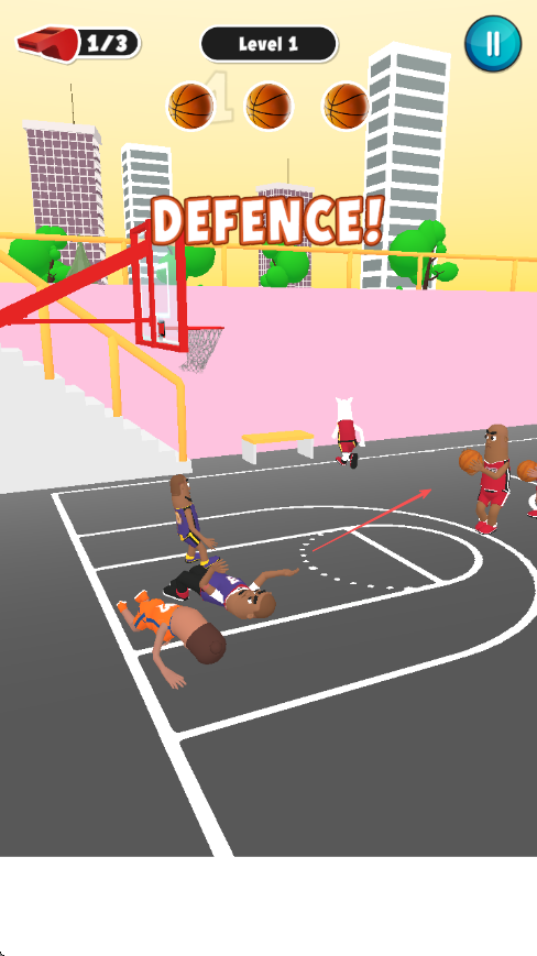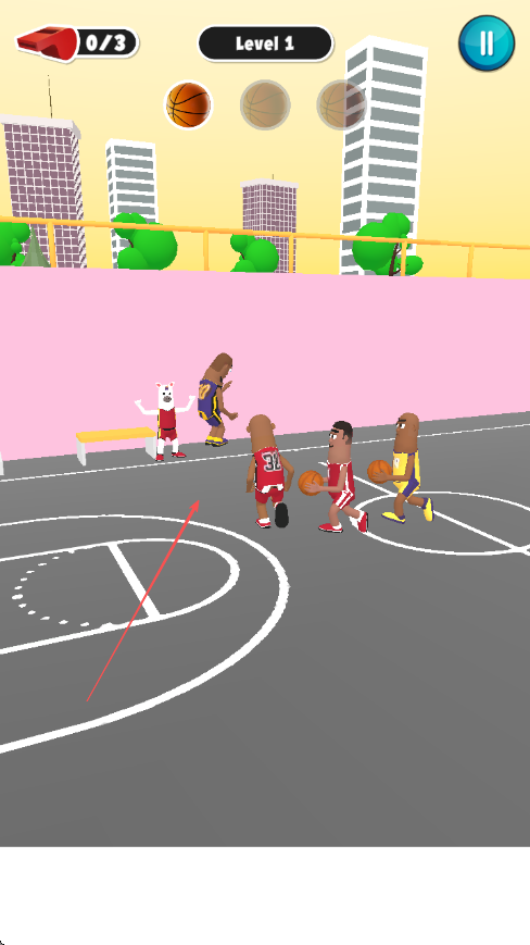 1、游戲開始注意Level1關(guān)卡,操控角色在場上移動,上方顯示需完成0/3個(gè)任務(wù),觀察籃球位置準(zhǔn)備行動。