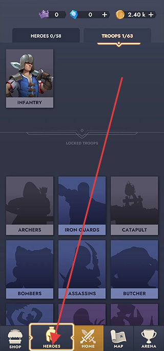 1、打開界面,點(diǎn)擊底部按鈕,查看已有的英雄角色,了解可解鎖的兵種等。