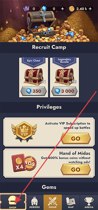2、點(diǎn)擊底部按鈕,進(jìn)入商店界面,可花費(fèi)350寶石購買EpicChest,或3000寶石購買LegendaryBundle,還能查看VIP特權(quán)和金幣加成選項(xiàng)。