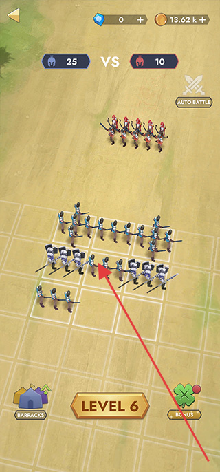 3、在戰(zhàn)斗界面中,觀察敵我雙方兵力,點(diǎn)擊AUTOBATTLE可自動(dòng)戰(zhàn)斗,合理排兵布陣爭(zhēng)取勝利。