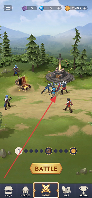 4、點(diǎn)擊底部按鈕回到主場(chǎng)景,點(diǎn)擊BATTLE按鈕可開啟戰(zhàn)斗,留意場(chǎng)景中的寶箱等元素,戰(zhàn)斗勝利獲取資源。