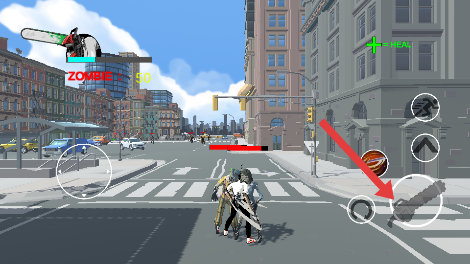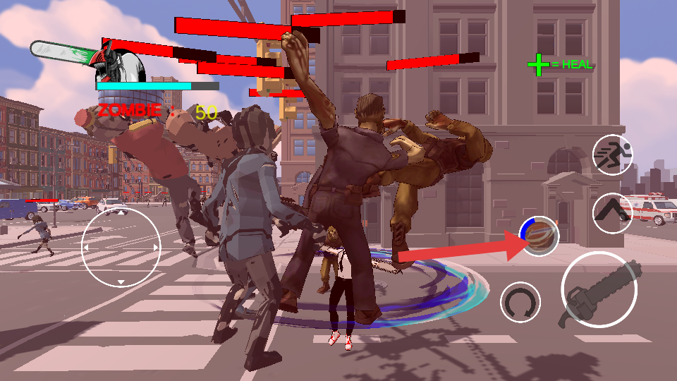 2、多樣化操作與簡易戰(zhàn)斗:通過虛擬按鍵實現(xiàn)移動、跳躍、翻滾、攻擊、技能釋放等多樣化操作,操作邏輯清晰易懂,同時僵尸僅有一種攻擊模式。