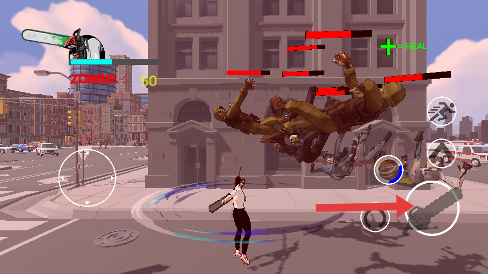 電鋸人大戰(zhàn)僵尸是一款依托“電鋸人”動漫IP打造的動作格斗作品,將動漫中的惡魔形象替換為僵尸,讓玩家操控主角次郎變身電鋸人,在充滿僵尸的場景中展開連擊收割,作品通過虛擬按鍵設(shè)計實現(xiàn)全操作控制,玩家可操控角色完成上下左右移動、跳躍、翻滾、基礎(chǔ)攻擊與技能釋放,僵尸僅有一種攻擊模式,降低了操作門檻。