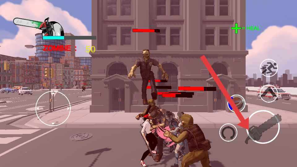 2、角色操控與戰(zhàn)斗執(zhí)行:戰(zhàn)斗過程中,通過虛擬按鍵控制角色上下左右移動,避開僵尸攻擊;點擊跳躍或翻滾按鍵躲避危險,同時用攻擊按鍵發(fā)起連擊。