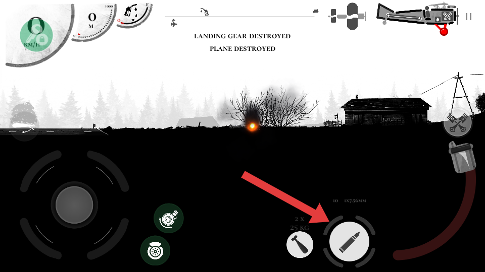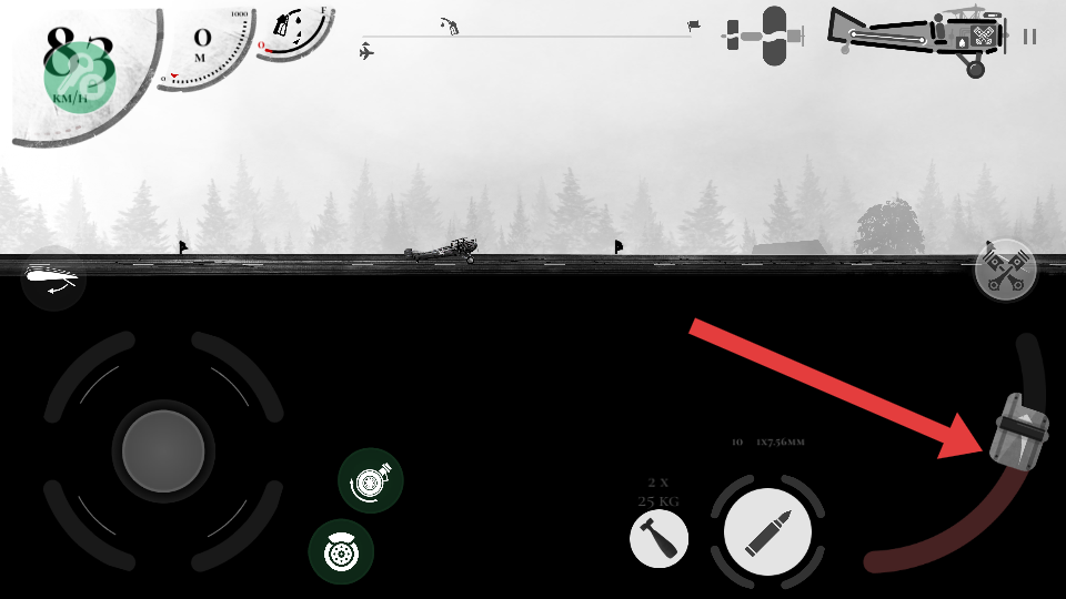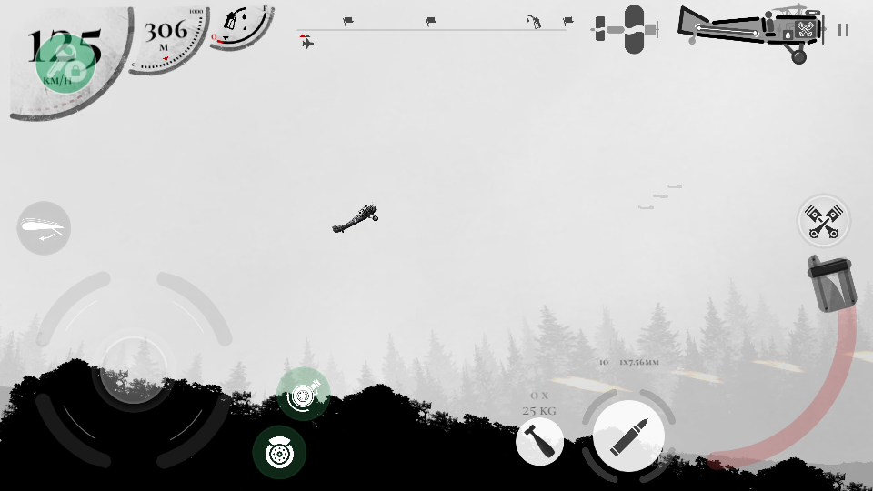 2、當(dāng)發(fā)現(xiàn)敵機時,點擊右側(cè)子彈圖標(biāo),向敵機發(fā)起射擊,同時通過左側(cè)操控區(qū)域靈活調(diào)整戰(zhàn)機方向,追蹤敵機,提高射擊命中率。