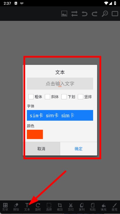 4、點(diǎn)擊底部的文本按鈕,彈出文本編輯窗口,輸入文字,設(shè)置字體、下劃線、豎排等樣式以及文字顏色。