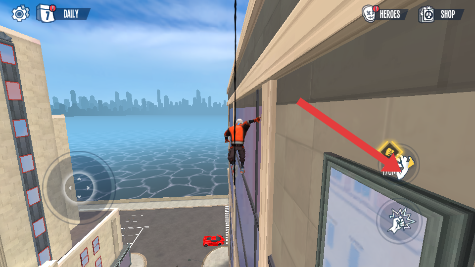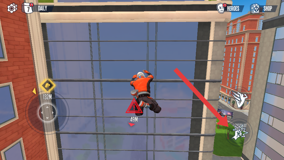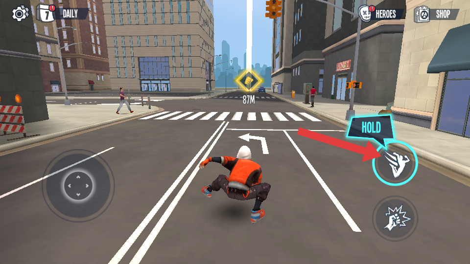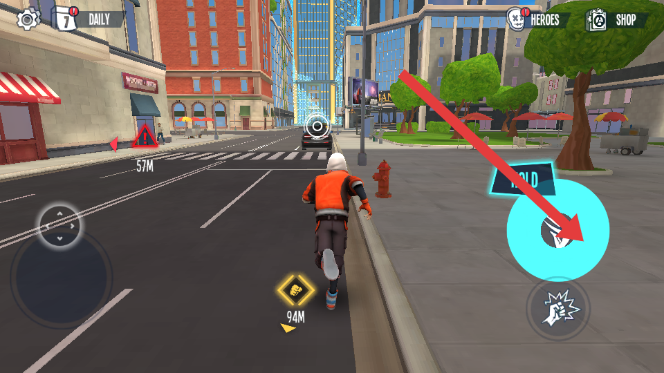 1、進(jìn)入城市跑酷場景后,先熟悉角色基礎(chǔ)操作,點擊屏幕左側(cè)控制角色左右移動,右側(cè)跳躍按鈕用于跨越街道縫隙。