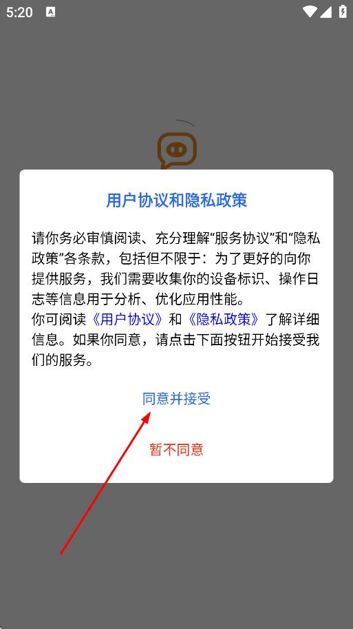 1、在用戶協(xié)議和隱私政策彈窗中,點擊同意并接受,進入客服聊天頁面。