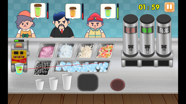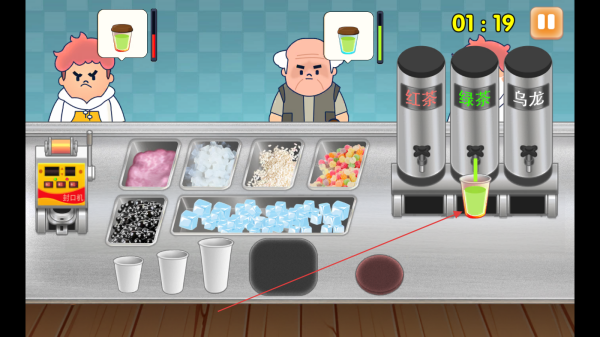 2、顧客出現(xiàn)后,觀察其需求,如顧客想要的奶茶樣式,從空杯子開(kāi)始,按順序添加相應(yīng)配料等。