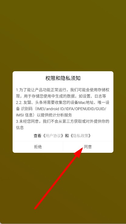 1、打開(kāi)APP,在彈出的權(quán)限和隱私須知提示框中,點(diǎn)擊同意按鈕。