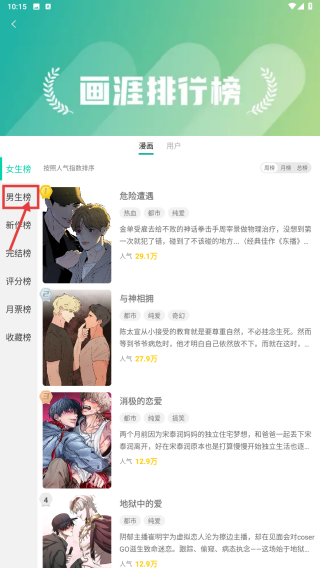 2、在排行榜頁面,點(diǎn)擊男生榜選項(xiàng),查看男生向漫畫排行。