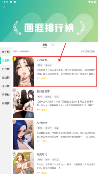 3、在男生榜漫畫列表里,點(diǎn)擊無盡游戲漫畫條目,進(jìn)入作品詳情頁。