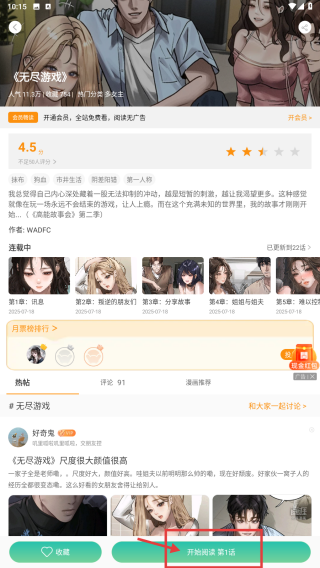 4、在作品詳情頁,點(diǎn)擊開始閱讀/對話按鈕,進(jìn)入漫畫閱讀或互動環(huán)節(jié)。