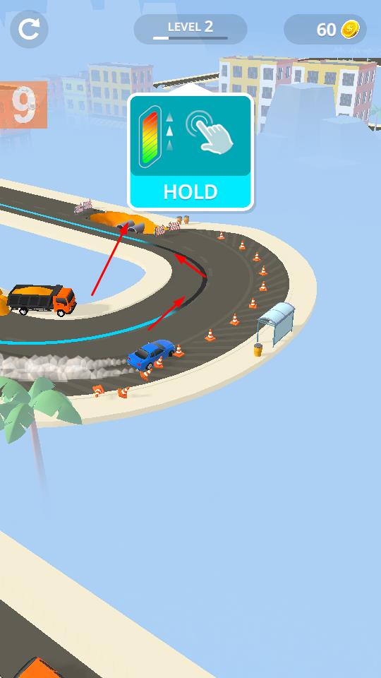 1、進入游戲關(guān)卡,根據(jù)HOLD提示操作,控制車輛在帶有彎道、路障的賽道行駛,避開施工區(qū)域等障礙。