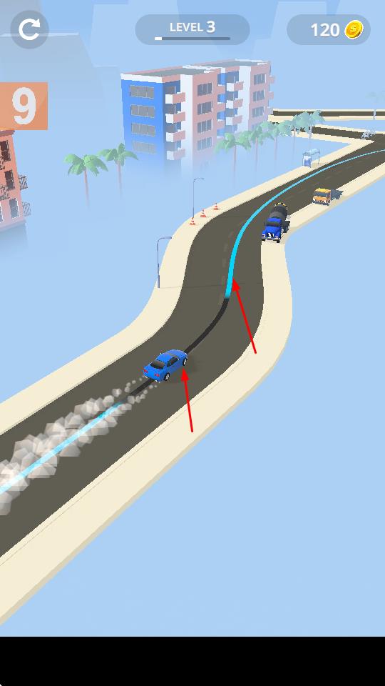 2、駕駛車輛沿賽道藍色路徑前進,在城市道路場景中,留意其他車輛,保持行駛方向,順利通過彎道。