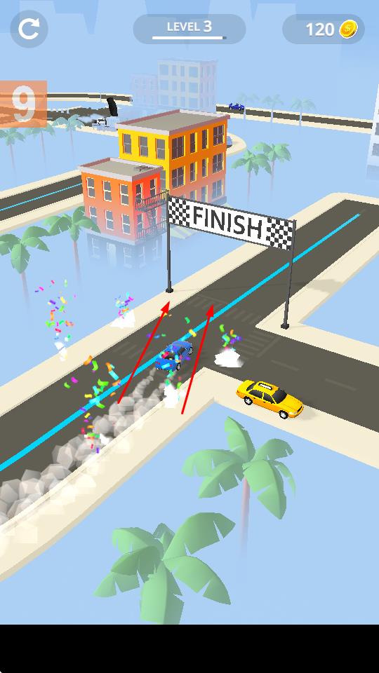 3、努力操控車輛沖過FINISH終點線,完成關(guān)卡,獲取金幣獎勵,解鎖后續(xù)關(guān)卡。
