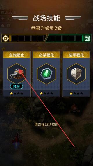 3、戰(zhàn)機(jī)升級(jí)后出現(xiàn)戰(zhàn)場(chǎng)技能選擇界面可在主炮強(qiáng)化、必殺強(qiáng)化、裝甲強(qiáng)化中挑選技能增強(qiáng)戰(zhàn)力。