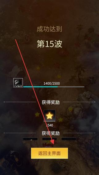 4、成功達(dá)到一定波次如第15波后查看獲得的獎(jiǎng)勵(lì)點(diǎn)擊返回主界面按鈕結(jié)束當(dāng)前戰(zhàn)斗回合。