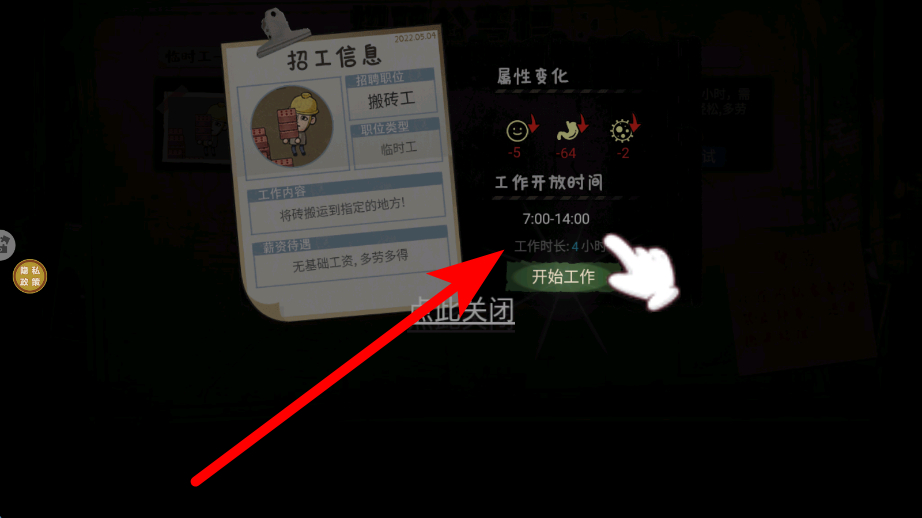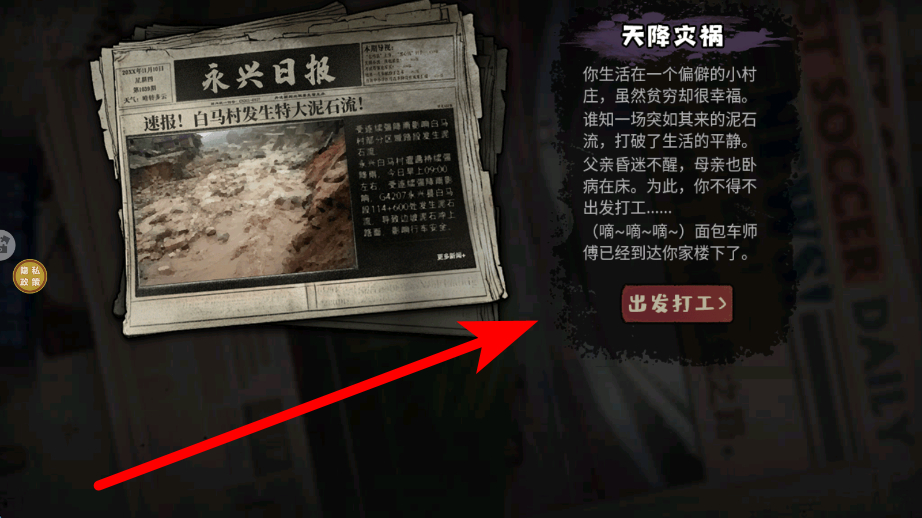 1、玩家出發(fā)打工時(shí),點(diǎn)擊出發(fā)打工,即可開啟打工之旅,離開原本的場(chǎng)景,前往打工的相關(guān)地點(diǎn),開啟后續(xù)的找工作、工作等流程。