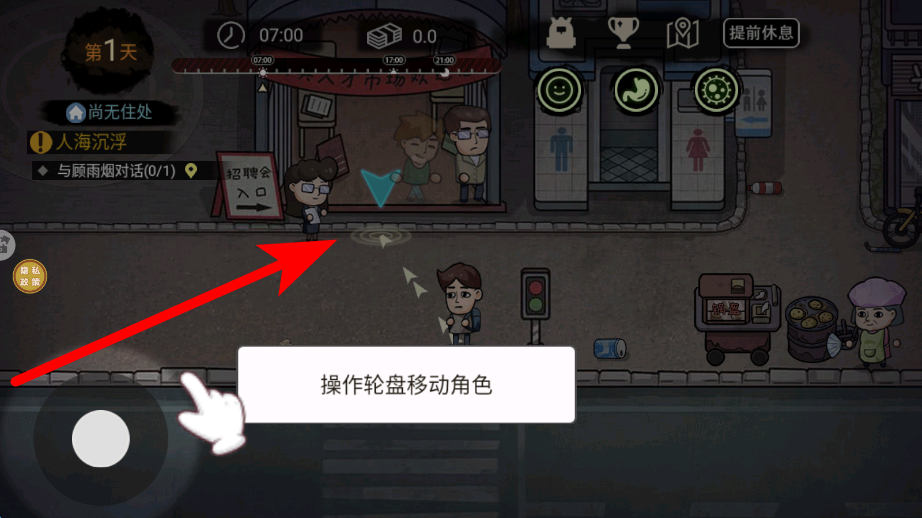 2、移動(dòng)人才市場(chǎng)主線對(duì)話需操作輪盤移動(dòng)角色,前往人才市場(chǎng),與相關(guān)人物進(jìn)行主線對(duì)話,推進(jìn)打工模擬的劇情與任務(wù)進(jìn)程,獲取工作信息。