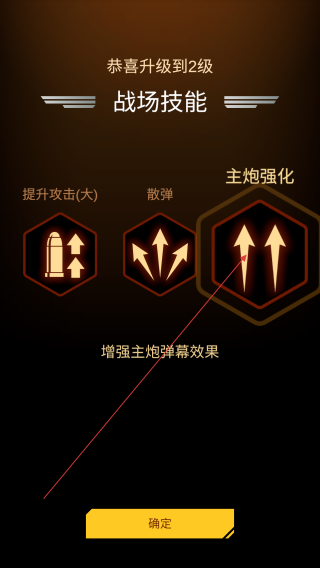 2、戰(zhàn)機(jī)升級(jí)后出現(xiàn)戰(zhàn)場(chǎng)技能選擇界面,如選擇主炮強(qiáng)化里的增強(qiáng)主炮彈幕效果點(diǎn)擊確定,提升戰(zhàn)力。
