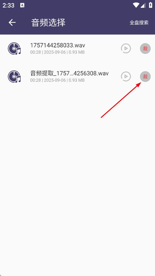 2、在音頻選擇頁面,點(diǎn)擊要裁剪的音頻右側(cè)的裁,進(jìn)入音頻裁剪頁面。