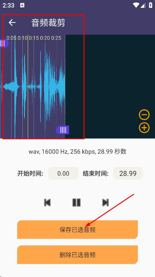 3、在音頻裁剪頁面,裁剪好音頻后,點(diǎn)擊保存已選音頻,保存裁剪后的音頻。