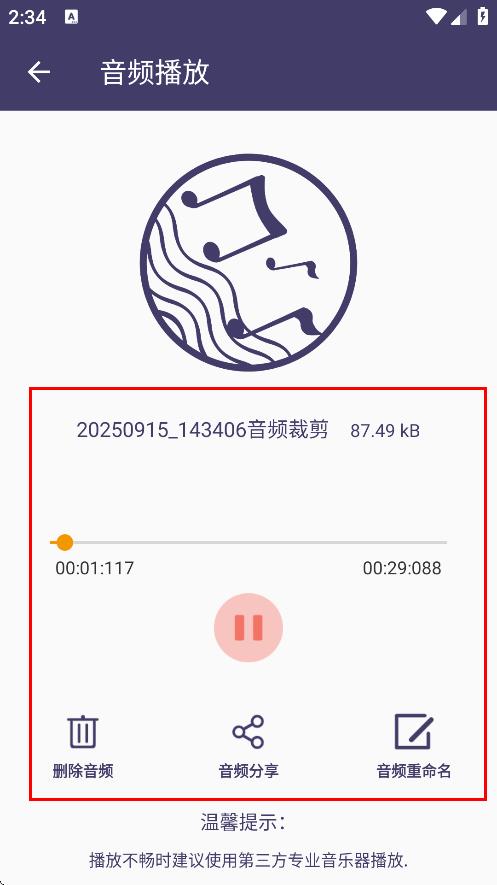 4、保存后進(jìn)入音頻播放頁面,可進(jìn)行播放、刪除等操作。