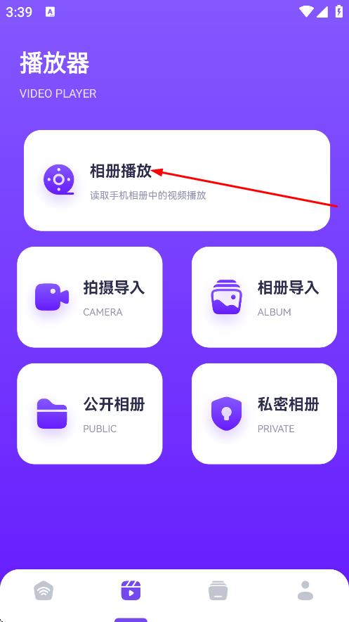 3、在播放器頁面,點(diǎn)擊相冊播放,讀取手機(jī)相冊中的視頻。