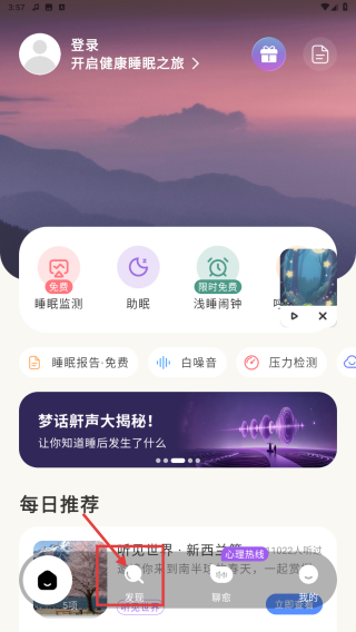 1、打開睡眠健康應(yīng)用,點(diǎn)擊發(fā)現(xiàn)選項(xiàng),進(jìn)入發(fā)現(xiàn)頁面。
