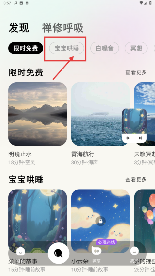 2、在發(fā)現(xiàn)頁面,點(diǎn)擊寶寶哄睡分類標(biāo)簽,查看寶寶哄睡相關(guān)內(nèi)容。