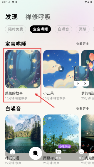 3、在寶寶哄睡內(nèi)容列表里,選擇菜菜的故事,點(diǎn)擊進(jìn)入故事播放頁面。