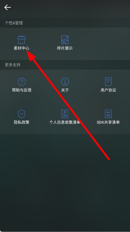 2、在功能菜單頁(yè)面,點(diǎn)擊素材中心選項(xiàng),進(jìn)入素材中心頁(yè)面。