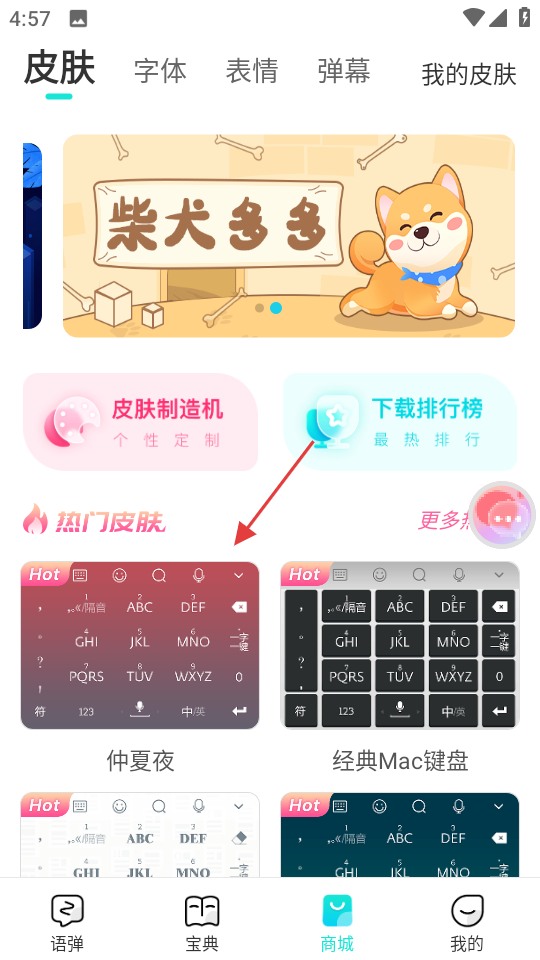 3、更換皮膚主題:進(jìn)入皮膚中心,瀏覽各類主題并選擇心儀款式,點(diǎn)擊應(yīng)用即可更換輸入法外觀,也可上傳圖片自定義皮膚,打造專屬界面。