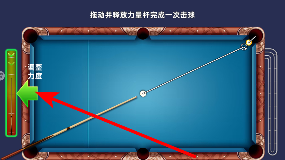 2、調(diào)整擊球力度需拖動(dòng)力量桿,根據(jù)擊球的需求,調(diào)整好合適的力度,然后釋放力量桿完成一次擊球,控制臺(tái)球的運(yùn)動(dòng)軌跡與力度。
