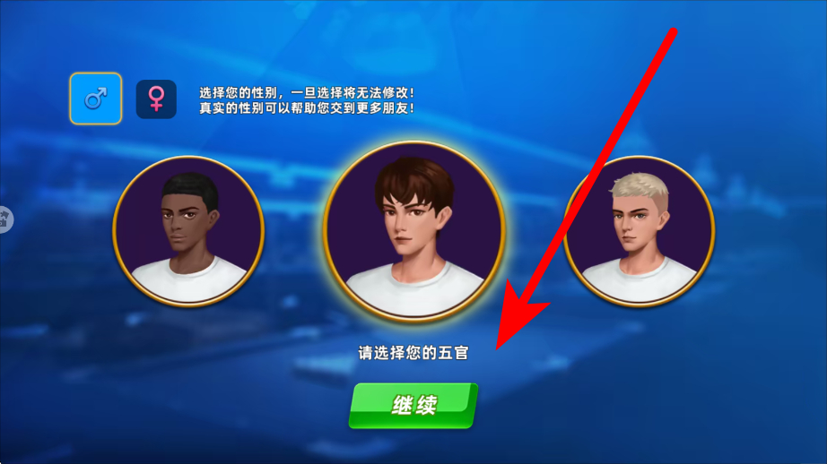 3、角色創(chuàng)建時(shí),選擇自己的性別,再挑選五官等,打造出個(gè)性化的角色形象,之后點(diǎn)擊繼續(xù),開啟臺(tái)球游玩之旅。
