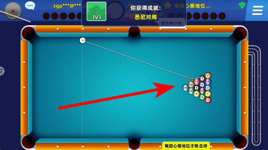 4、參與對(duì)局時(shí),在臺(tái)球桌上,根據(jù)臺(tái)球的分布情況,運(yùn)用移動(dòng)球桿、調(diào)整力度等操作,參與1V1等對(duì)局,體驗(yàn)臺(tái)球競(jìng)技的樂趣。