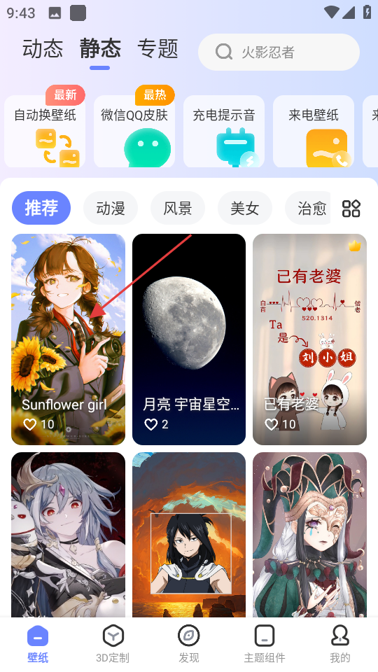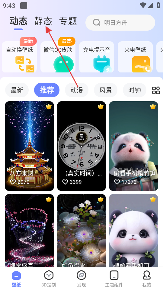 1、在壁紙頁(yè)面,點(diǎn)擊靜態(tài)選項(xiàng),切換到靜態(tài)壁紙展示界面。