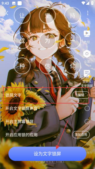 4、在文字鎖屏設(shè)置頁(yè)面,可編輯鎖屏文字,然后點(diǎn)擊設(shè)為文字鎖屏,完成文字鎖屏設(shè)置。