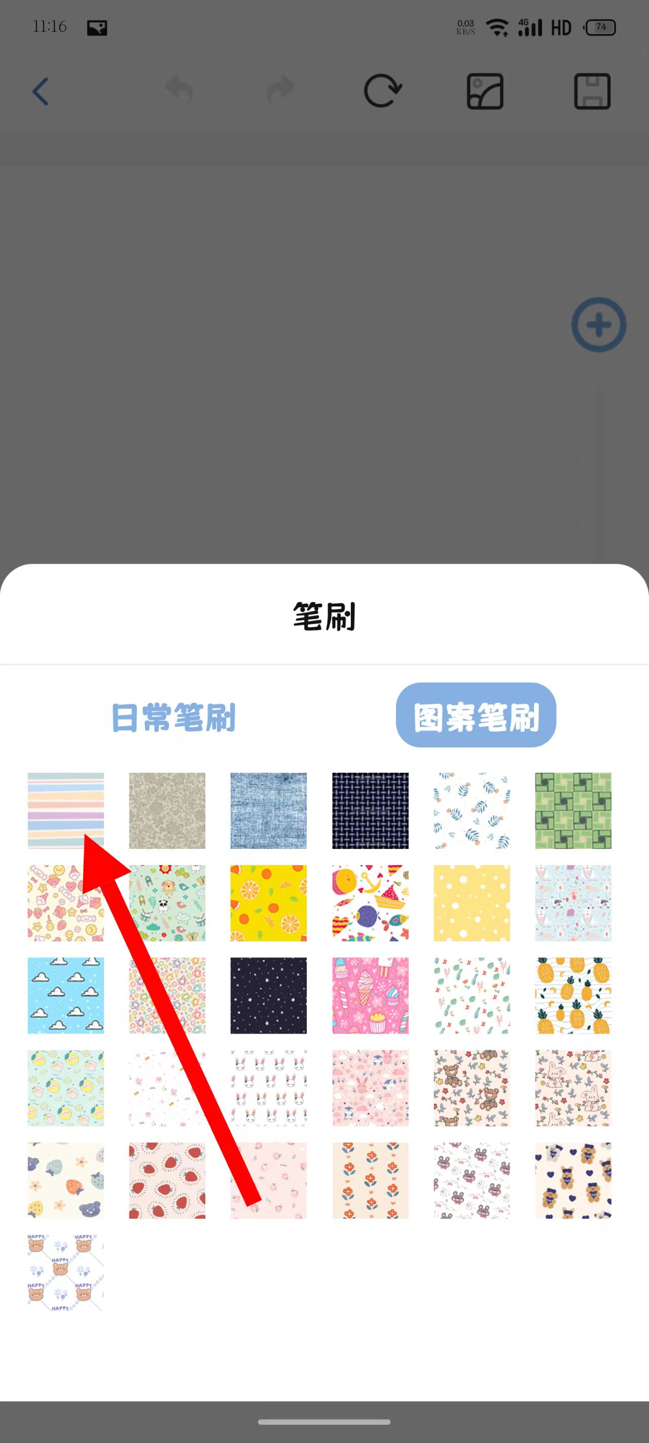 2、點(diǎn)擊底部的筆刷選項(xiàng),在彈出的筆刷選擇框中,切換到圖案筆刷標(biāo)簽頁(yè)。