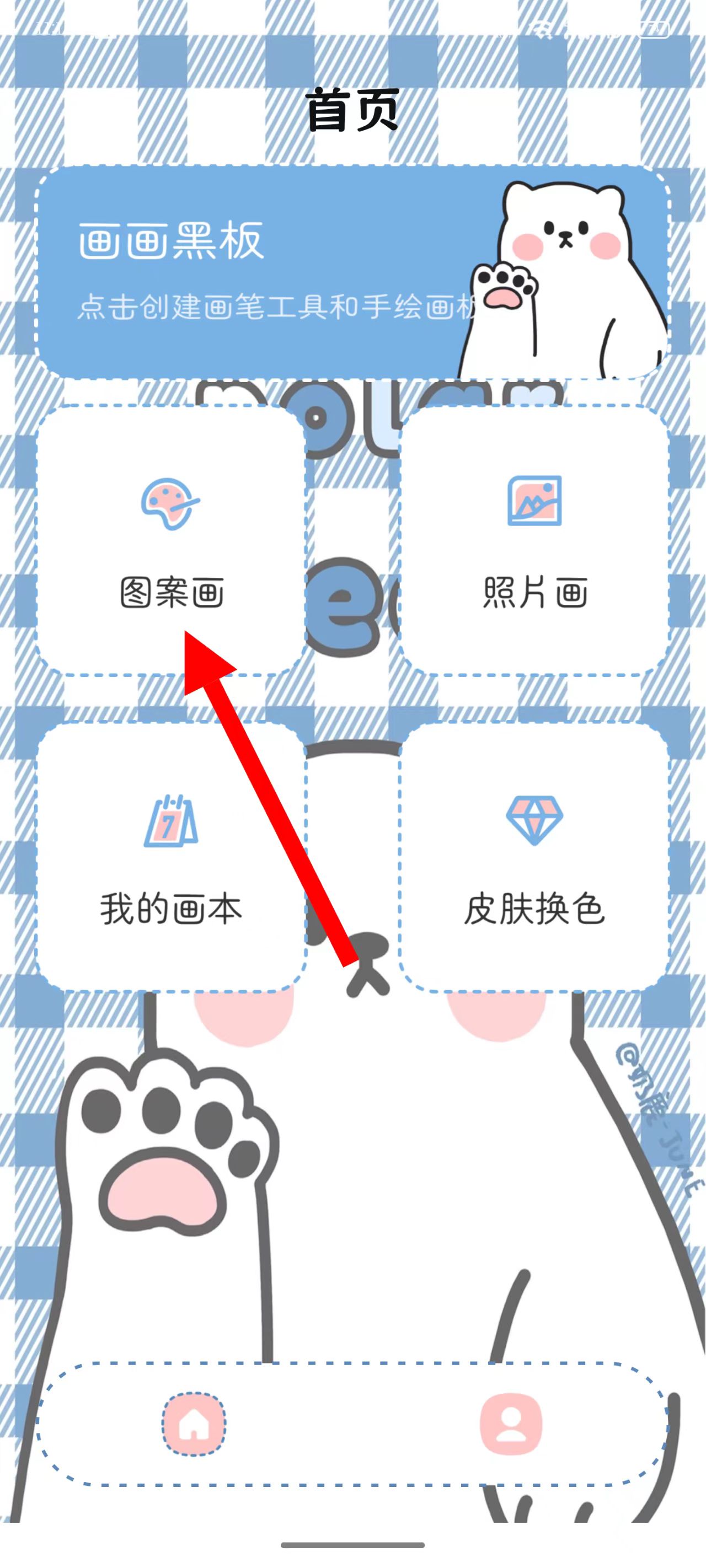 1、打開(kāi)APP,進(jìn)入首頁(yè)后,點(diǎn)擊圖案畫(huà)選項(xiàng),進(jìn)入圖案畫(huà)創(chuàng)作頁(yè)面。