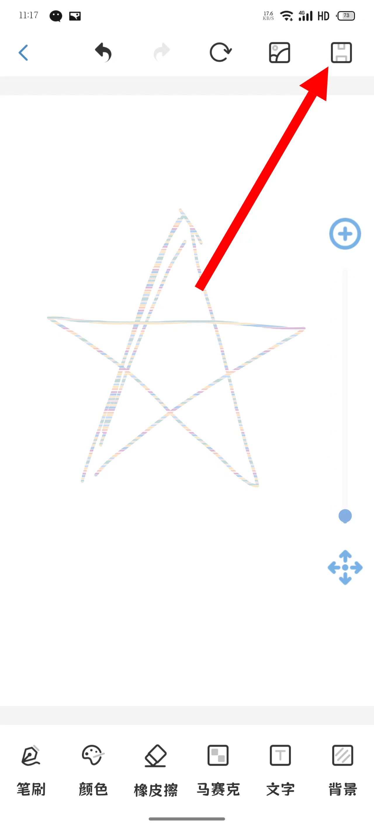 4、創(chuàng)作完成后,點(diǎn)擊右上角的保存圖標(biāo),即可保存繪制的圖案畫(huà)作品。