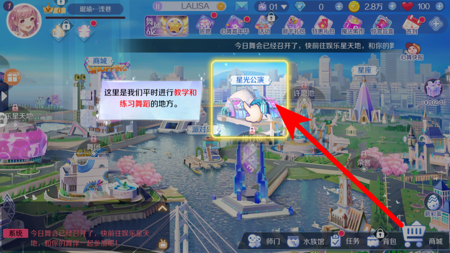 2、新手玩家進(jìn)入演出場(chǎng)地需在主界面,選擇星光公演,進(jìn)入到用于教學(xué)和練習(xí)舞蹈的場(chǎng)地,為接下來(lái)的舞蹈演出做好準(zhǔn)備。