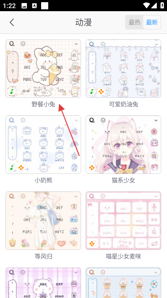 3、在動漫皮膚列表里,點擊選擇野餐小兔皮膚。