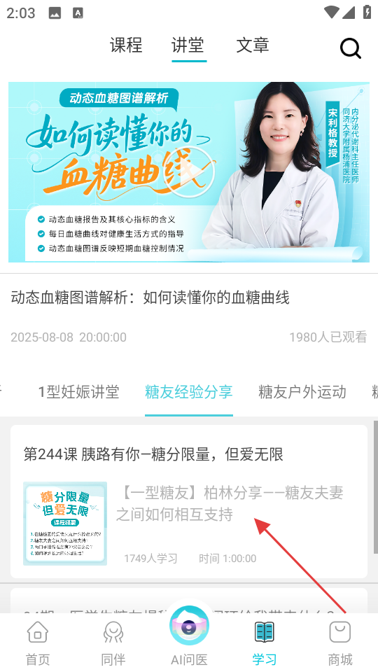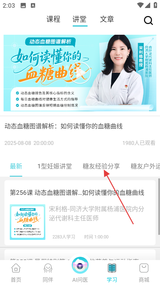 2、進入學習頁面后,點擊糖友經(jīng)驗分享分類。