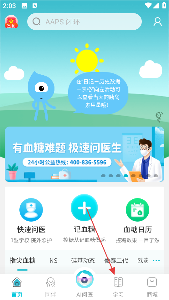 1、打開糖糖圈首頁,點擊底部的學習選項。