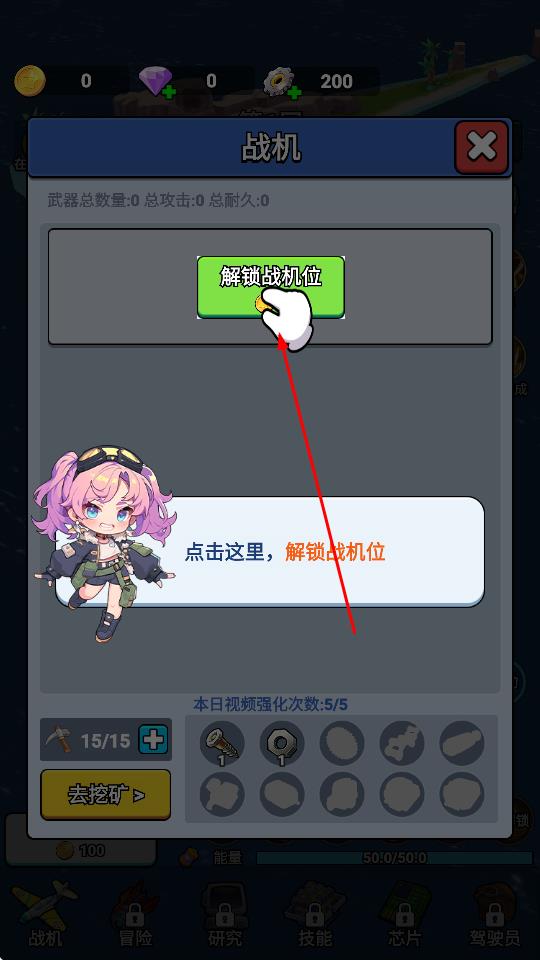 1、進(jìn)入戰(zhàn)機(jī)界面,點(diǎn)擊解鎖戰(zhàn)機(jī)位按鈕,開啟戰(zhàn)機(jī)使用權(quán)限,為后續(xù)戰(zhàn)斗與養(yǎng)成打基礎(chǔ)。
