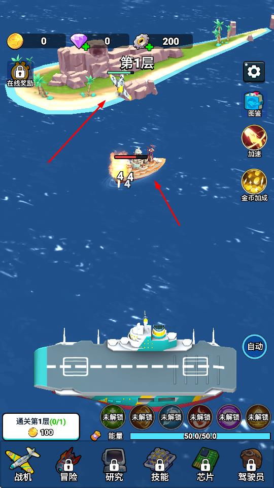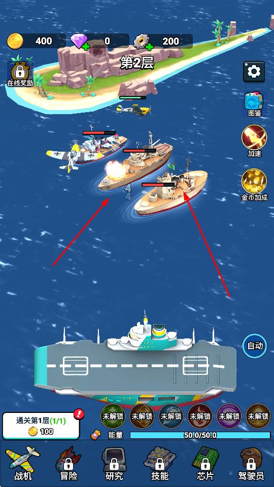 2、操控戰(zhàn)機(jī)參與海上戰(zhàn)斗,攻擊敵方船只,推進(jìn)第1層、第2層等關(guān)卡進(jìn)程,獲取戰(zhàn)斗獎(jiǎng)勵(lì)。