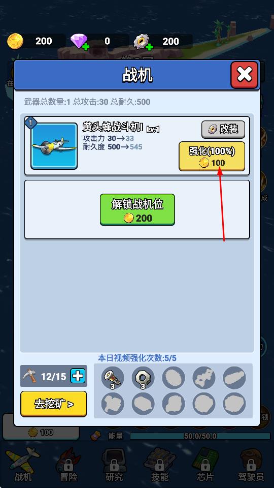 3、在戰(zhàn)機(jī)界面,消耗金幣對(duì)黃頭蜂戰(zhàn)斗機(jī)等機(jī)型進(jìn)行強(qiáng)化,提升攻擊力與耐久度,增強(qiáng)戰(zhàn)機(jī)戰(zhàn)力。
